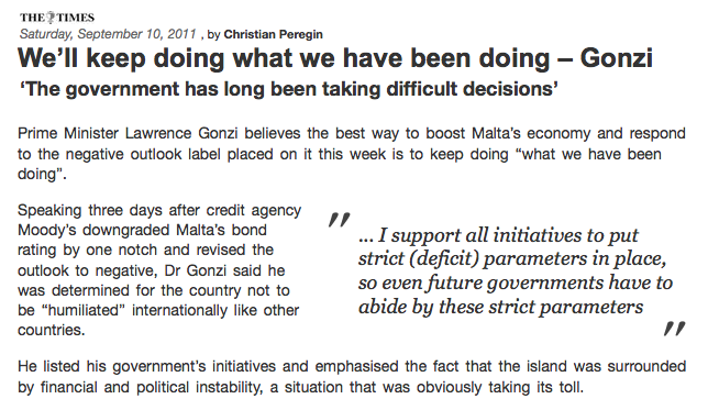 Fil-bidu ta’ din il-leġislatura Lawrence Gonzi approva żieda ta’ 500 fil-ġimgħa lill-MPs, imma issa, ftit minuti ilu ħareġ jgħid li ser ineħħiha “sabiex jgħati l-ewwel sinjal li l-Gvern qed jieħu azzjoni biex insalvaw l-ekonomija u nilqgħu għall-mewġ tal-2012”